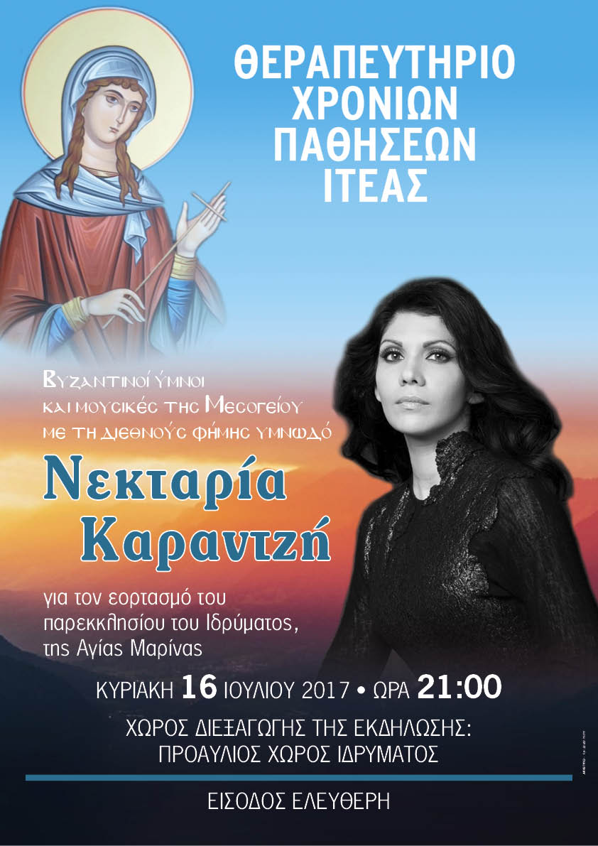 Την Κυριακή 16 Ιουλίου 2017, ώρα 21:00, το Θεραπευτήριο Χρόνιων Παθήσεων Ιτέας επ’ ευκαιρία του εορτασμού του παρεκκλησίου του, της Αγίας Μαρίνας, μετά την τέλεση του απογευματινού εσπερινού και με τις ευλογίες του Σεβασμιωτάτου Μητροπολίτη Φωκίδος κ.κ. Θεοκτίστου, διοργανώνει συναυλία με τη διεθνούς φήμης υμνωδό, Νεκταρία Καραντζή και τη σύμπραξη καταξιωμένων μουσικών.